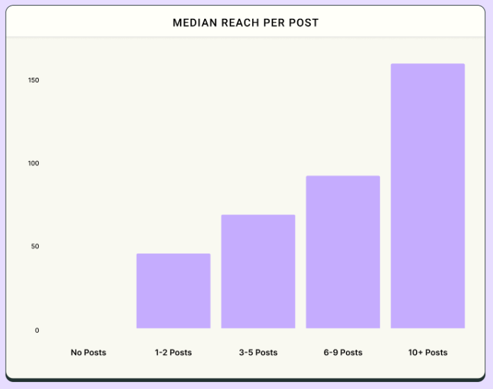 A recent study by Buffer shows that accounts that post frequently get more views on each piece of content. Strikingly, the highest jump occurs when you move from posting 1-2 times each week to 3-5 times.