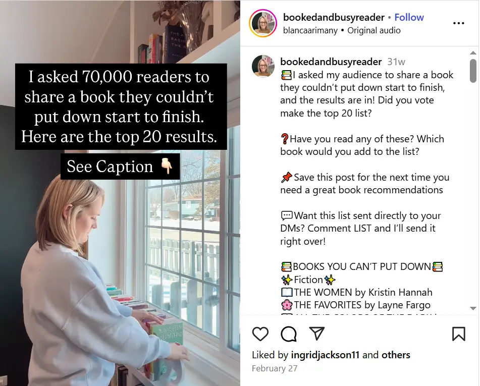 The Instagram post encourages users to save it for future reference. It also displays a synopsis of what the post is all about, with a specific niche on book readership.